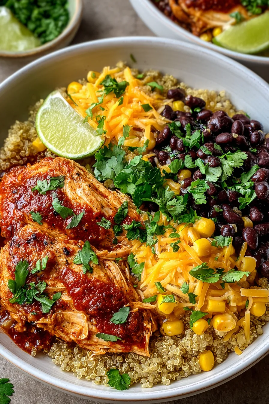 Juicy shredded chicken mixes with savory enchilada sauce and spices, then gets layered with hearty beans, crisp vegetables, and creamy toppings for a satisfying bowl you’ll look forward to eating. Finished with fresh herbs and a touch of cheese, this balanced meal delivers rich flavor and keeps you full longer, perfect for lunches, dinners, or anytime you want a comforting but nutritious dish.