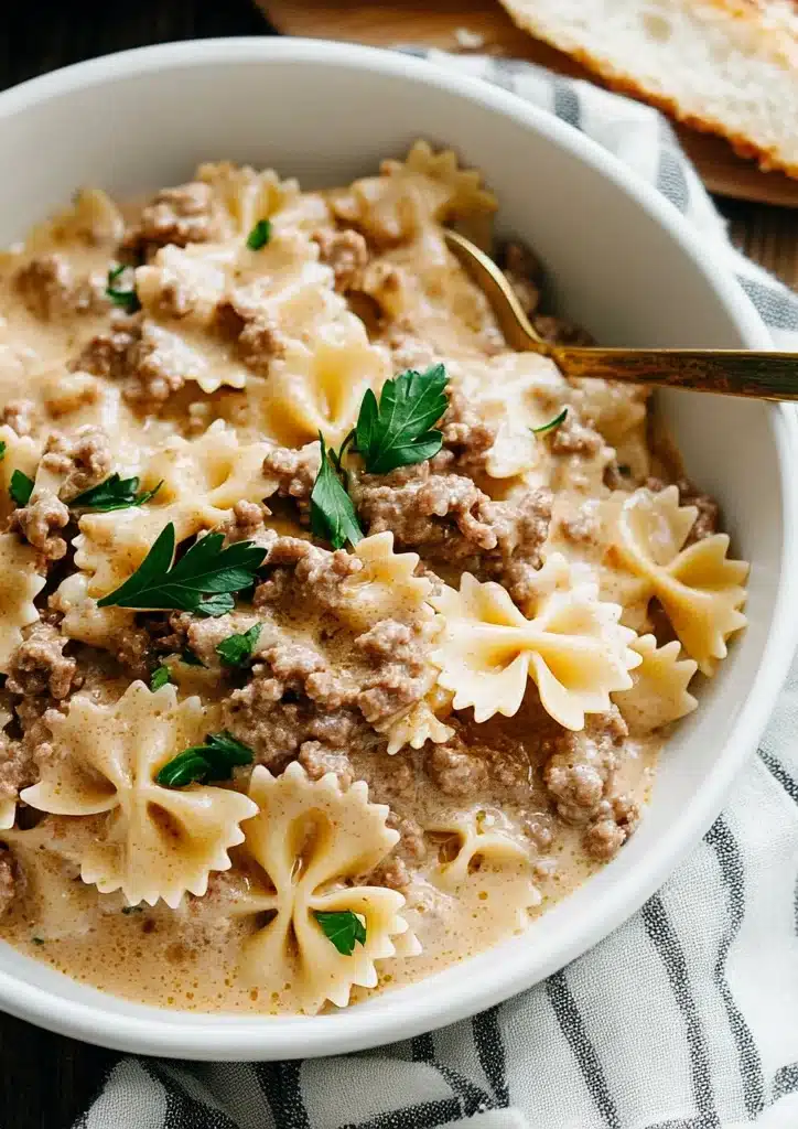 Our Creamy Ground Beef & Bowtie Pasta is the ultimate comfort meal. Tender ground beef and perfectly cooked bowtie pasta come together in a rich, savory, cheesy cream sauce that delivers satisfying flavor in every bite