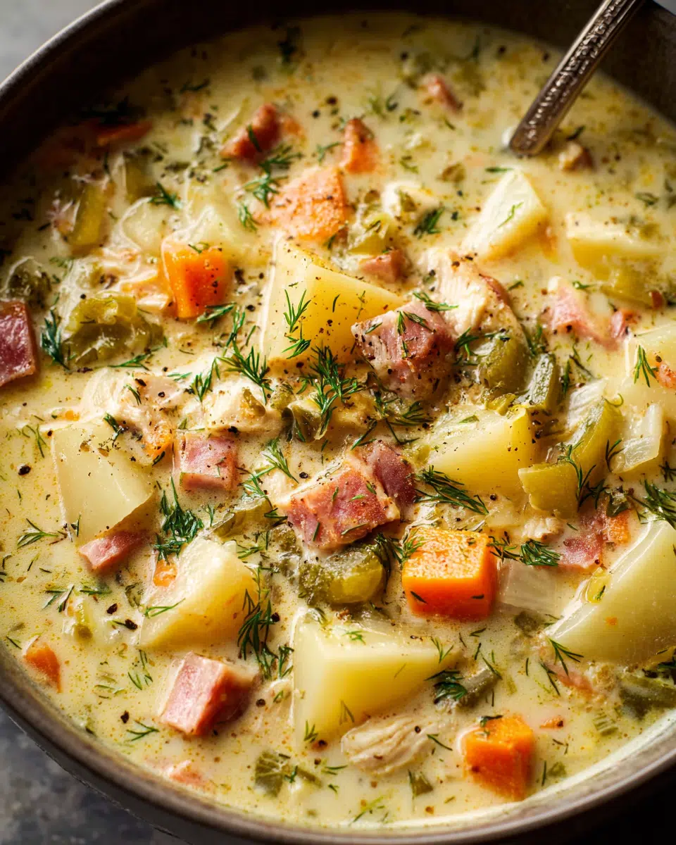 potatoes, onion, garlic, vegetable broth, dill, butter, cream, salt, black pepper, chicken, bacon