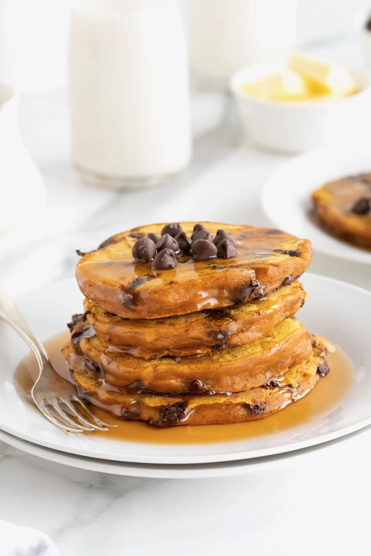 These Pumpkin protein Chocolate Chip Pancakes are fluffy pancakes that are lightly spiced, loaded with pumpkin, and made extra special with chocolate chips!