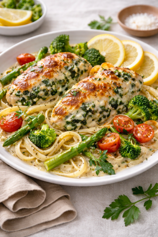 Juicy chicken stuffed with creamy feta, fresh spinach, and sun-dried tomatoes, creating a rich and savory spring meal with pasta, comes with roasted seasonal vegetables.