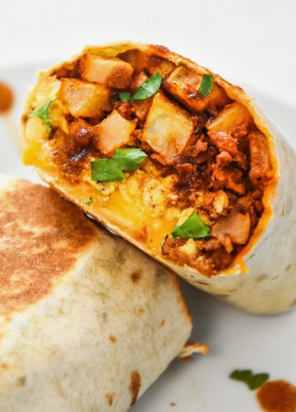 Indulge in the most delicious breakfast burrito! Loaded with fluffy eggs, cheese, pork chorizo, cilantro and potatoes. Its filling, savory and delicious!